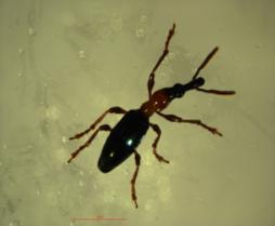 成虫:体长5.0~8.0 mm,体形细长如蚁,触角末节、前胸、足为红褐色至桔红色,其他部分呈蓝黑色,具金属光泽,头部延伸成细长的喙,状如象鼻,咀嚼式口器着生于喙的末端,复眼半球形略突,黑色。